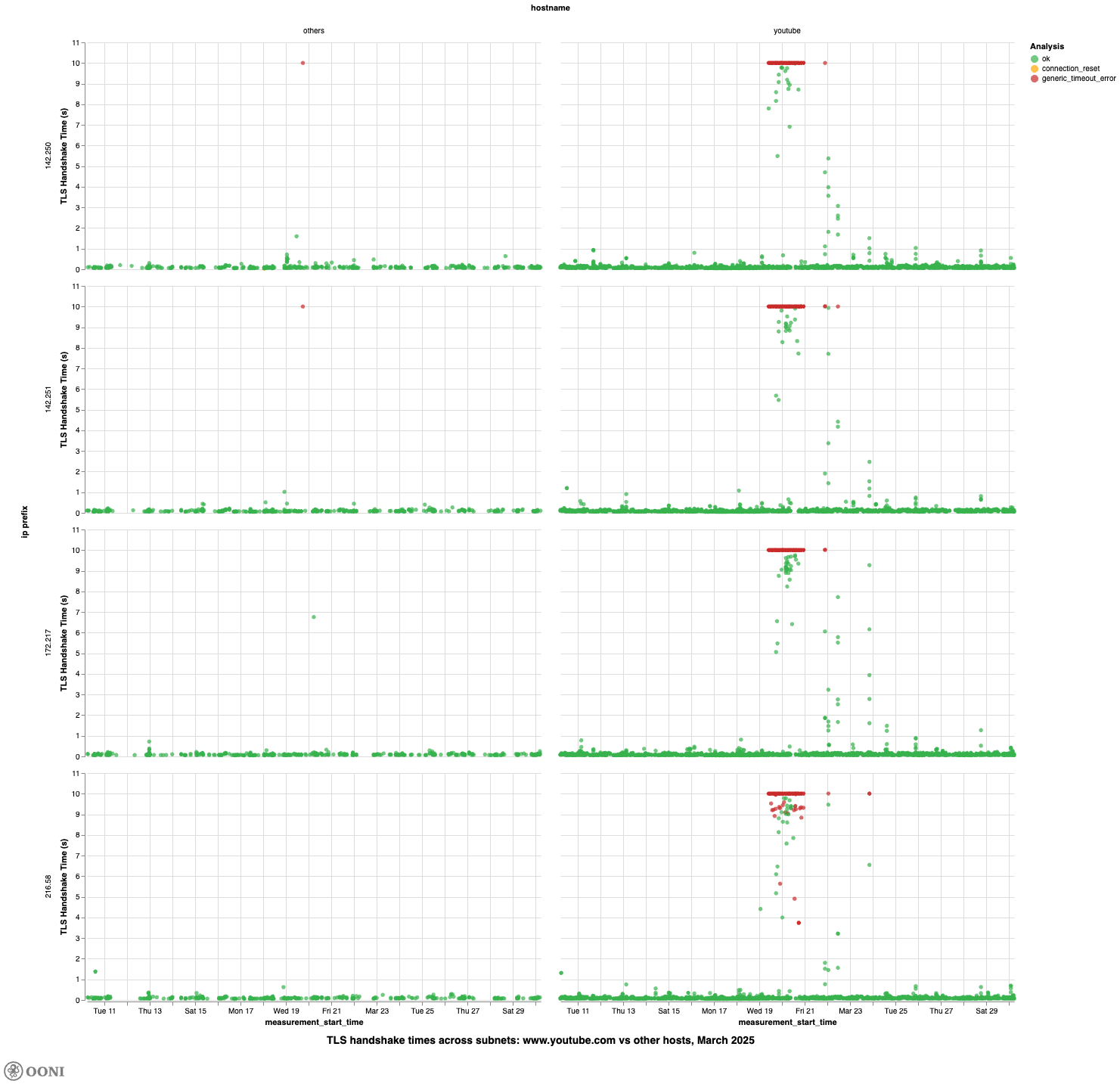 Given that the TLS handshake time for www.youtube.com was significantly longer than for 30 other hostnames that shared similar network paths or were hosted on the same infrastructure (Google) during the same period (from 10th to 30th March 2025), there is strong indication that access to YouTube was throttled in Türkiye.