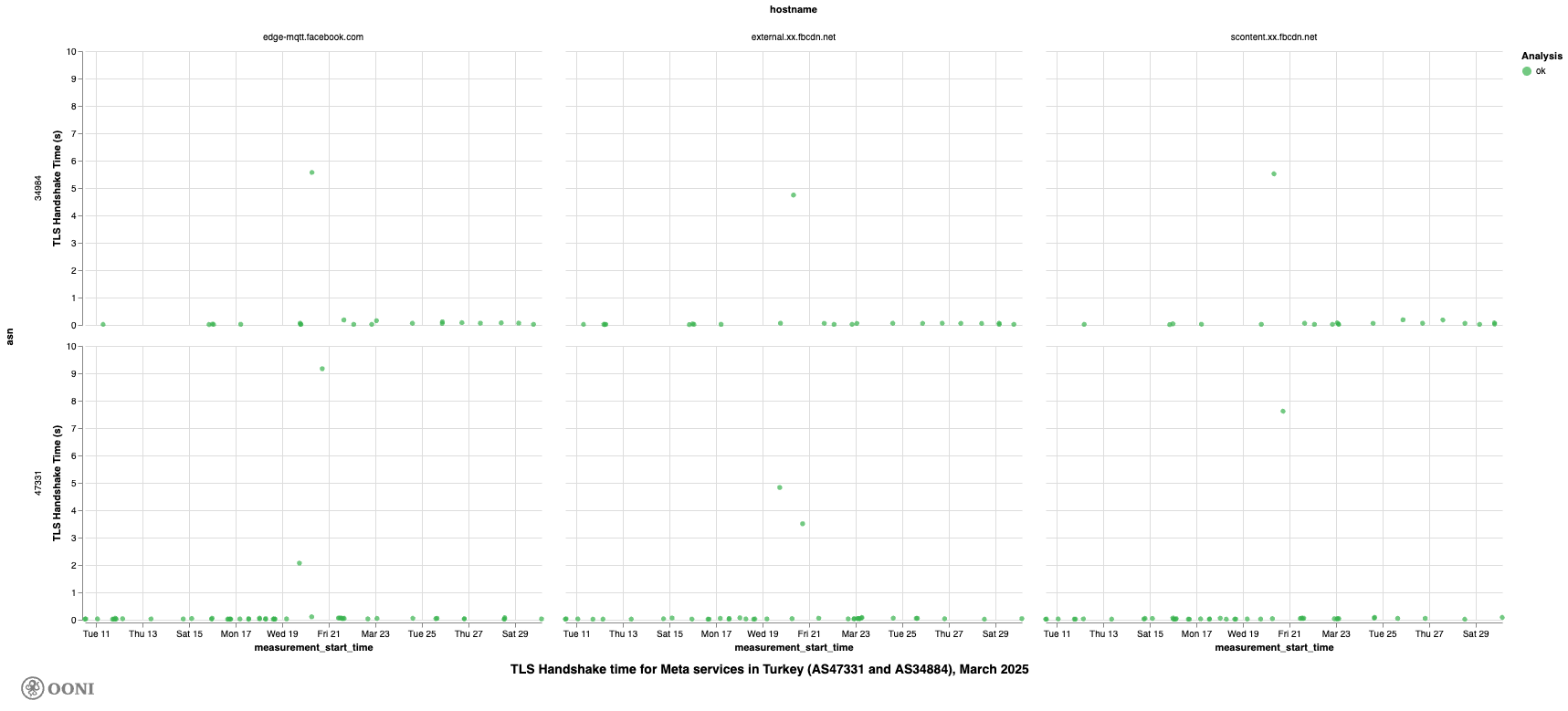 twitter.comwas significantly longer than for 19 other hostnames using the same IP prefixes (162.159.0.0/16 and 172.66.0.0/16) and tested on the same network (AS47331) during the same period, there is strong indication that access to Twitter was throttled. The same pattern of throttling on the same networks was observed on both 19–20 March 2025 and 8th September 2025. - Throttling of Facebook, Instagram, and WhatsApp. OONI data shows that the testing of Instagram, WhatsApp, and Facebook domains and endpoints exhibited long TLS handshake times – indicating the presence of throttling – on both 19–20 March 2025 and 8th September 2025.