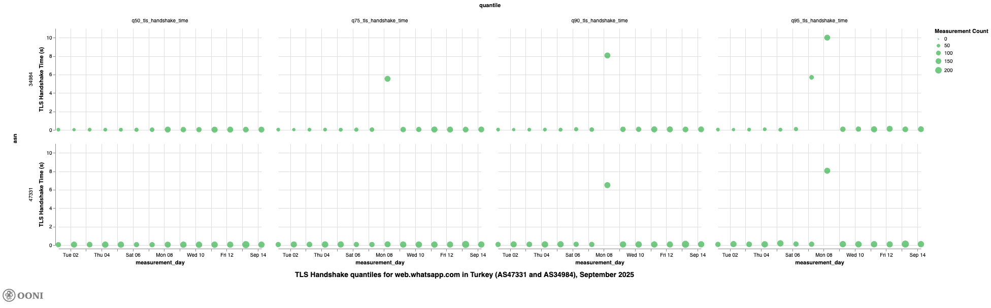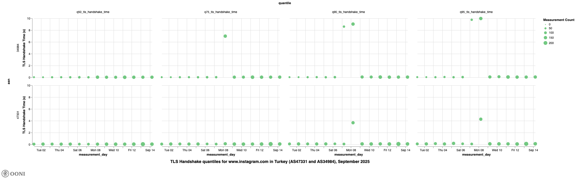 It’s worth noting, though, that we observe high TLS handshake quantile values for www.tiktok.com on TTNET (AS47331) and Turkcell Superonline (AS34984) on 8th September 2025, further suggesting that access to TikTok was throttled in Türkiye on that day.