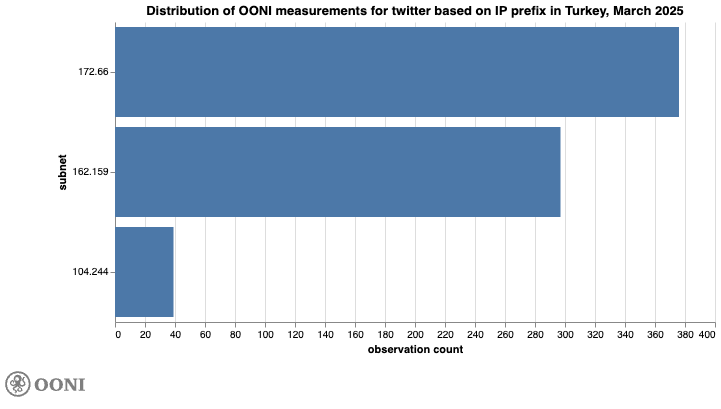 Chart: Distribution of OONI measurements for twitter.com based on IP prefix in Türkiye, March 2025 (source: OONI data).