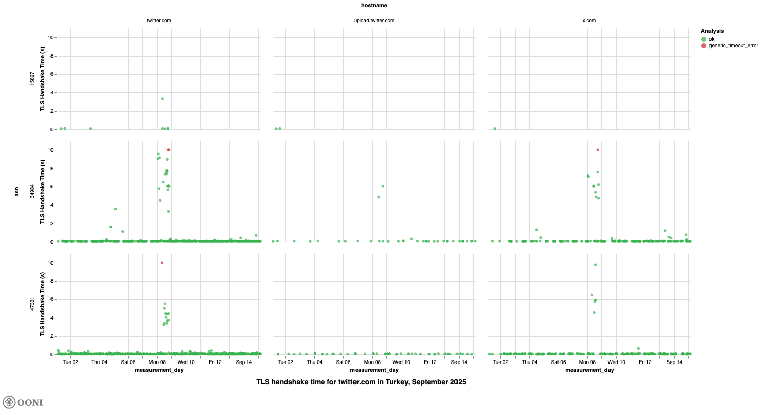 As is evident, the above chart indicates major throttling signals on two networks – TTNET (AS47331) and Turkcell Superonline (AS34984) – where we observe long TLS handshake times (especially in comparison to the third AS in the chart). These are the same two networks where we previously observed the throttling of Twitter/X in March 2025 (discussed previously). Even though OONI measurement coverage is significantly larger for twitter.com in comparison to the measurement coverage for upload.twitter.com and x.com, we can still see that the testing of these hostnames results in longer TLS handshake times on TTNET (AS47331) and Turkcell Superonline (AS34984). These throttling signals are stronger around 8th September 2025.